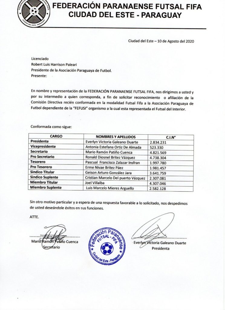 La Federación Paranaense de Futsal FIFA a través de su nueva Comisión Directiva emitió la nota a la Asociación Paraguaya de Fútbol pidiendo el reconocimiento y afiliación. La Comisión Directiva de la FPFF quedó de la siguiente manera: Everlyn Galeano Duarte (Presidente), Antonia Ortiz de Almada (Vicepresidente), Mario Patiño (Secretario), Ronald Britez (Pro Secretario), Pascual Zalazar (Tesorero), Erme Britez (Pro Tesorero), Geison González (Sindico Titular), Cristian Del Puerto (Sindico Suplente), Joel Villalba (Miembro Titular), Luis Mieres (Miembro Suplente).
