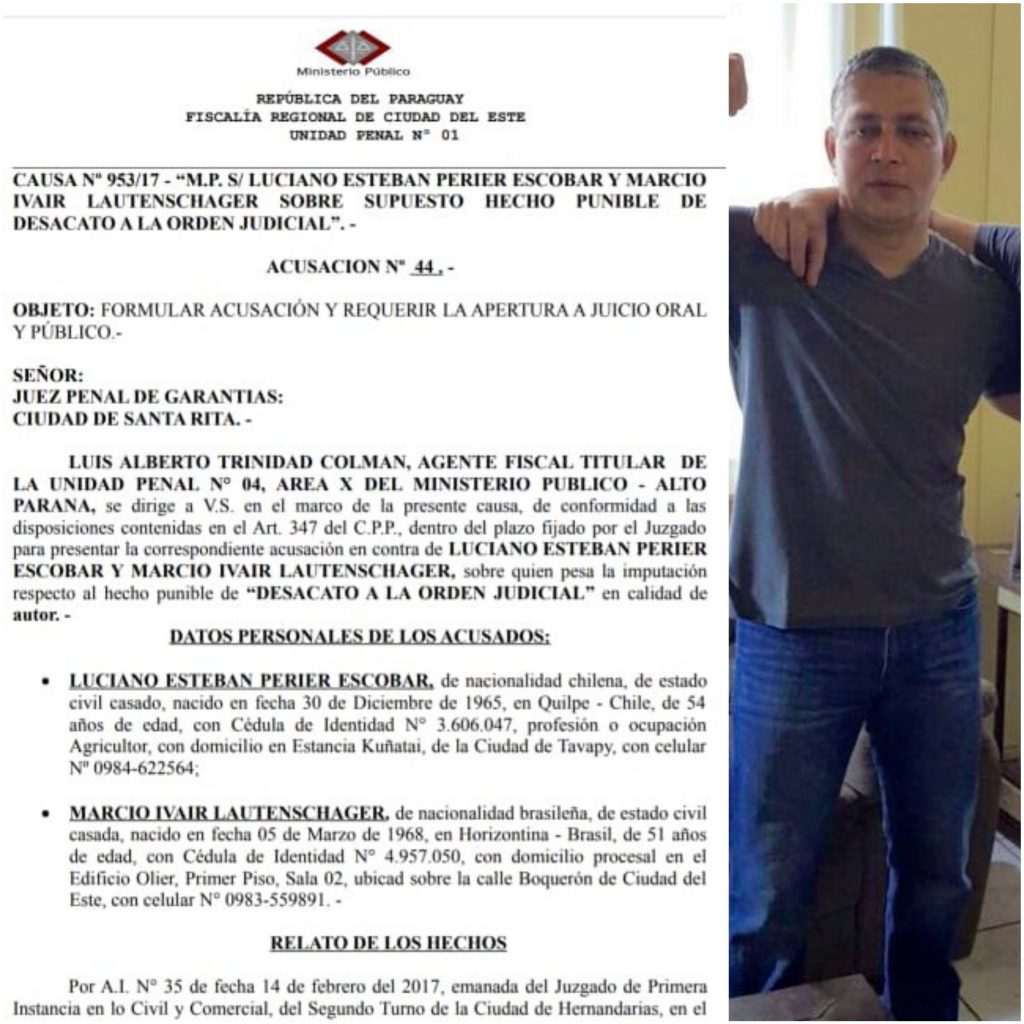 Según el requerimiento Fiscal del Abogado Luis Alberto Trinidad Colmán, agente fiscal de la Unidad Penal N°4, Area X del Ministerio Público – Alto Paraná, presentado el pasado 21 de agosto del año en curso, Luciano Esteban Perier y Marcio Ivair Lautenschlager son los responsables por la comisión del hecho punible de desacato a la orden judicial emanada del Juzgado de Primera Instancia en lo Civil y Comercial, del Segundo Turno de la Ciudad de Hernandarias en el año 2017, que decreta la “Prohibición de Innovar” del inmueble propiedad de la Fundación Perier, en un juicio promovido por la Fundación contra varias personas por simulación ilícita, fraude en perjuicio a terceros y también ya venían reclamando la percepción de frutos por crédito de arrendamiento.