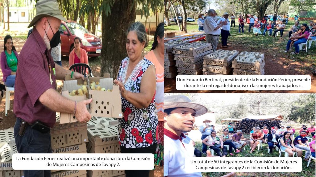 La Fundación Francis Perier hizo una importante donación de pollitos el pasado día martes 31 de agosto, a la Comisión de Mujeres Campesinas de Tavapy 2, informó Melanio Bogarín, coordinador de la fundación. El mismo indicó que fueron entregados una cantidad de aproximadamente 1750 pollitos, beneficiando de esta manera a unas 50 familias tavapyenses (aproximadamente 250 personas). La entrega se realizó en el local de la Cooperativa Yerbatera de Tavapy 2 y contó con la presencia del presidente vitalicio de la Fundación Perier, Don Eduardo Bertinat, el vicepresidente, Bjarne Rolf Fostervold, entre otros directivos.