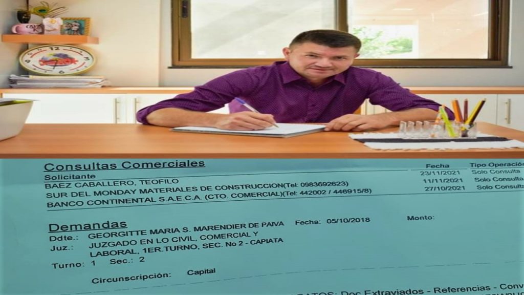 Según consta en un reporte de Informconf al cual tuvo acceso nuestro diario, el Ing. Teófilo “Cacho” Báez desde el año 2018 viene arrastrando una demanda por deuda, en el juzgado en lo Civil, Comercial y Laboral del Primer Turno de la ciudad de Capiatá, entablada por la comerciante Georgitte María Marendier de Paiva. A raíz de esta situación, el novel intendente de Tavapy, quien asumió el cargo hace 15 días aproximadamente, estaría inhabilitado para firmar cheques, operar cuentas corrientes y otros documentos bancarios, según indicaron nuestras fuentes en la municipalidad.