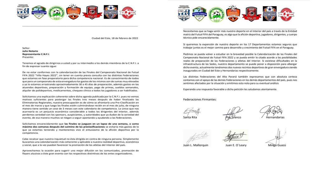 Federaciones de Futsal FIFA del Alto Paraná solicitaron a través de una nota en la persona de Julio Notario, representante del CNFI (Comisión Nacional de Futsal Interior), explicaciones con relación a los plazos para el desarrollo del próximo Nacional de Futsal 2022.