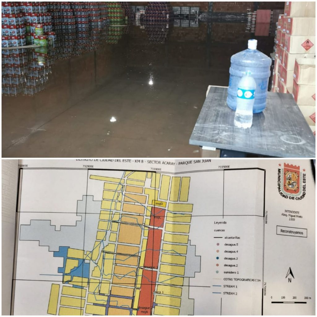 Inundación y perjuicio, a raíz de las intensas precipitaciones de ayer, se registró en el Parque Industrial San Juan, ubicado en el barrio del mismo nombre, en el Km. 8 y medio Acaray de CDE. De acuerdo a lo indicado por Teresita Bernal, administradora del Parque Industrial, el problema se viene arrastrando hace ya un buen tiempo, motivo por el cual en el año 2019 se había contactado con el profesional hidrogeólogo de la municipalidad de CDE, quien elaboró un proyecto para solucionar en forma definitiva el inconveniente, lo cual fue costeado por el Parque Industrial, que es el más afectado, así como también la zona baja del barrio San Juan.