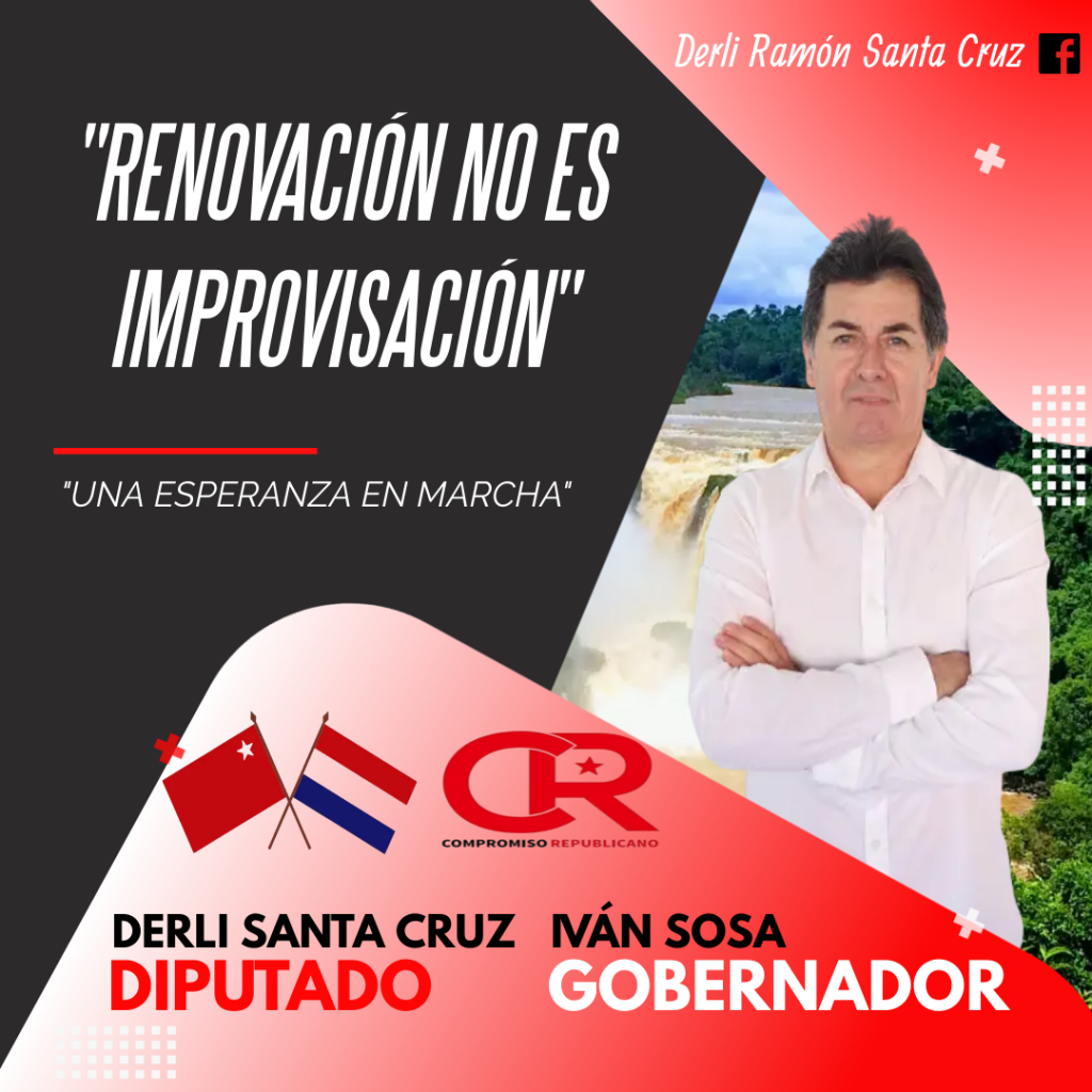 Entre las opciones y propuestas electorales para las próximas internas de la Asociación Nacional Republicana (ANR), el Lic. Derli Ramón Santa Cruz se presenta como alternativa a la diputación en representación del Décimo Departamento. Santa Cruz, integra el Movimiento Compromiso Republicano, liderado por el Dr. Iván Sosa, candidato a Gobernador del Alto Paraná.
