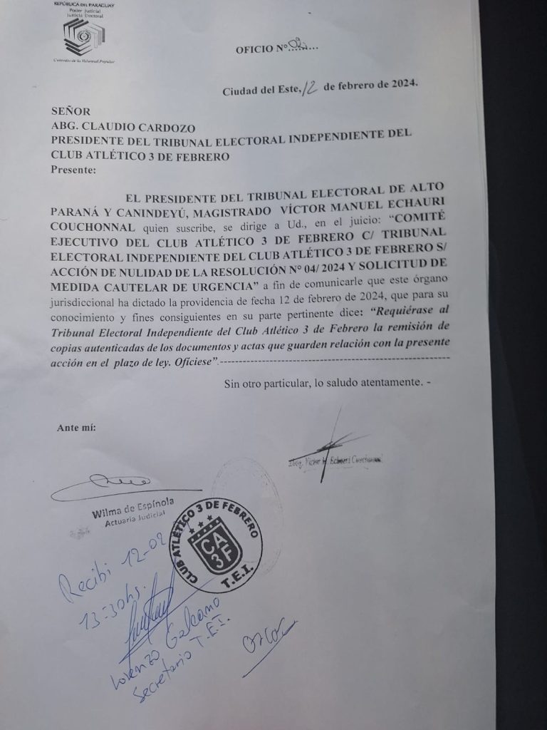 En la víspera, el presidente del Tribunal Electoral de Alto Paraná y Canindeyú, Magistrado Víctor Manuel Echauri Couchonnal, decidió impartir una acción de nulidad a la Resolución Nº 4/2024 del Tribunal Electoral Independiente del Club Atlético 3 de Febrero, en la cual suspendían los comicios que debieron realizarse el 10 de febrero. A su vez, solicito una medida cautelar de urgencia. Por otra parte, la Justicia Electoral solicitó la remisión de todas las documentaciones que guarden relación con el cronograma electoral. El Oficio Nº 02 fue recibido por Lorenzo Galeano, Secretario del TEI del 32 de Febrero. El plazo que tendrá el TEI del 3 de Febrero para entregar las documentaciones es de 5 días, según rige el Código Civil.